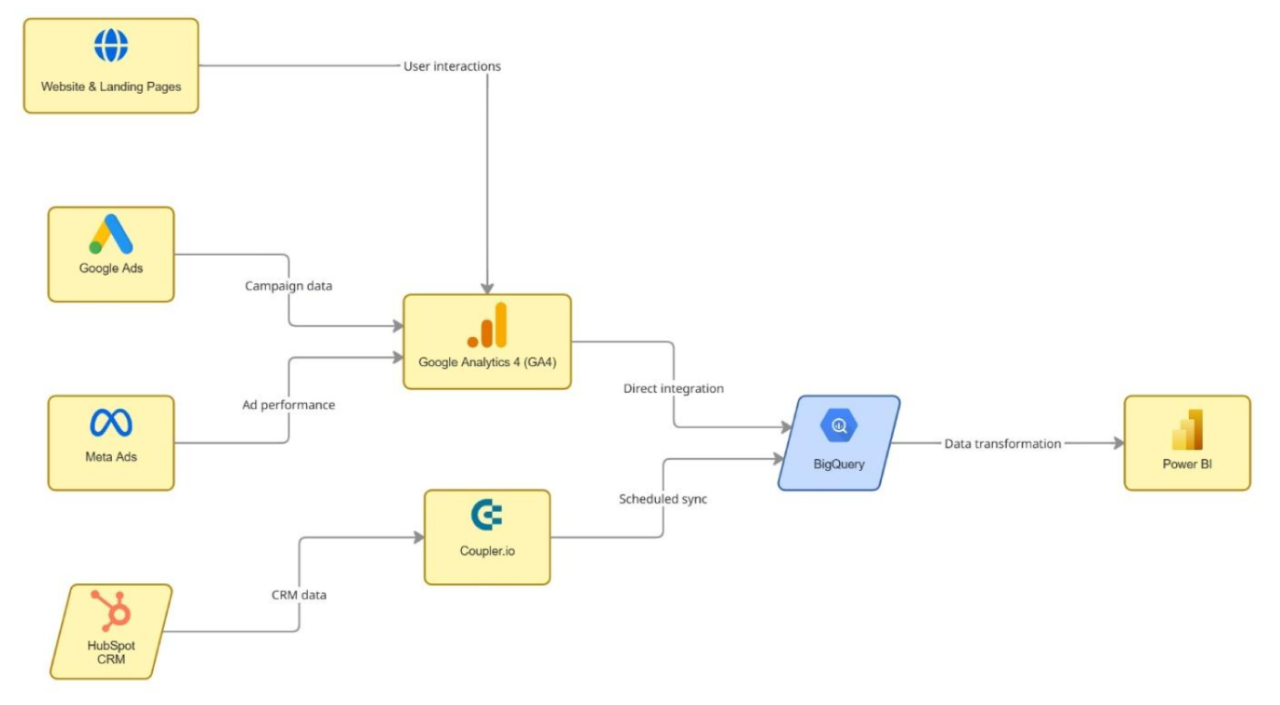 An integrated data architecture that connects HubSpot, GA4, and advertising platforms into BigQuery, enabling unified data modeling, custom attribution, and Power BI dashboards for end-to-end visibility into marketing and sales performance.